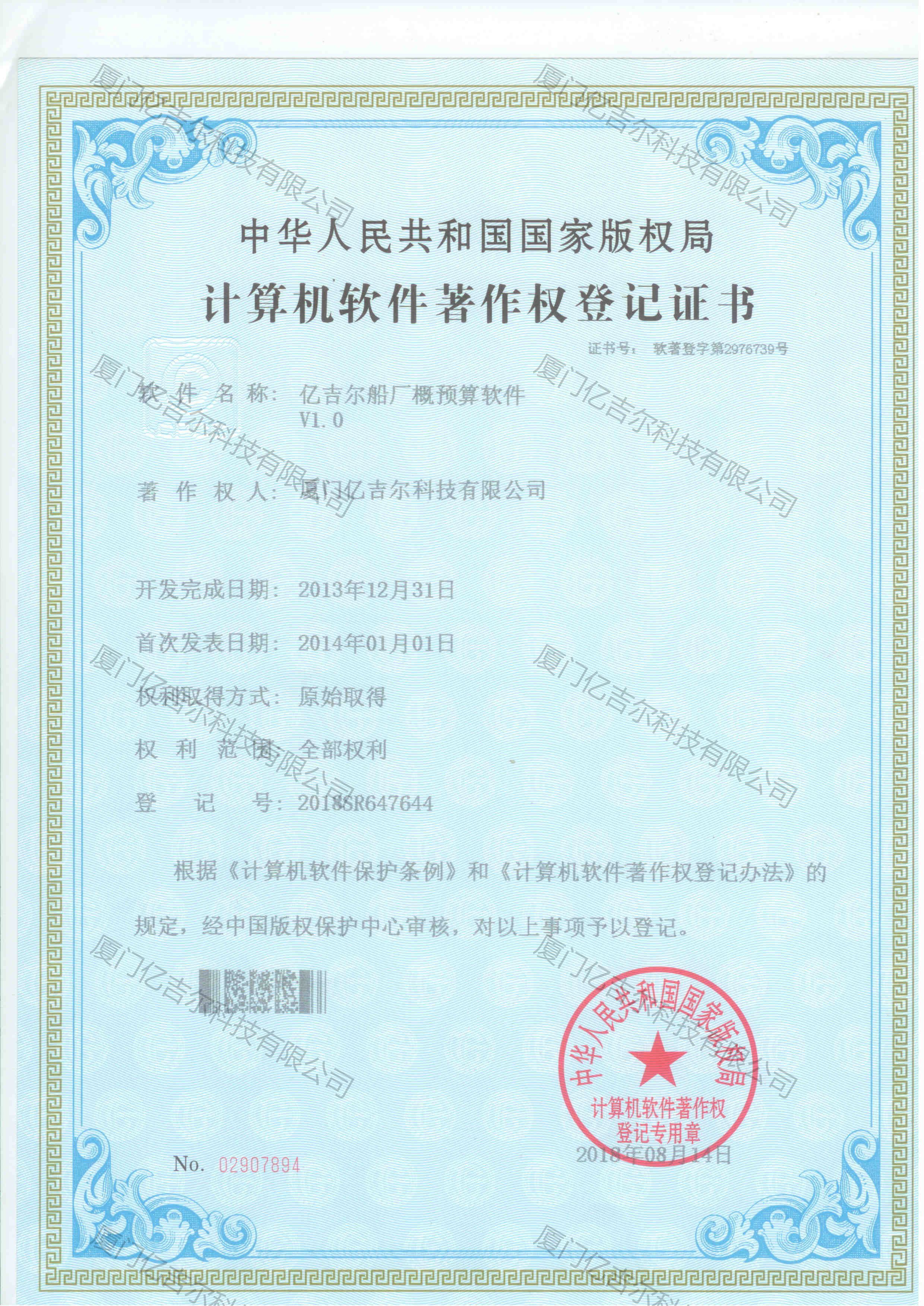 億吉爾船廠概預(yù)算軟件著作權(quán)登記證書(shū)