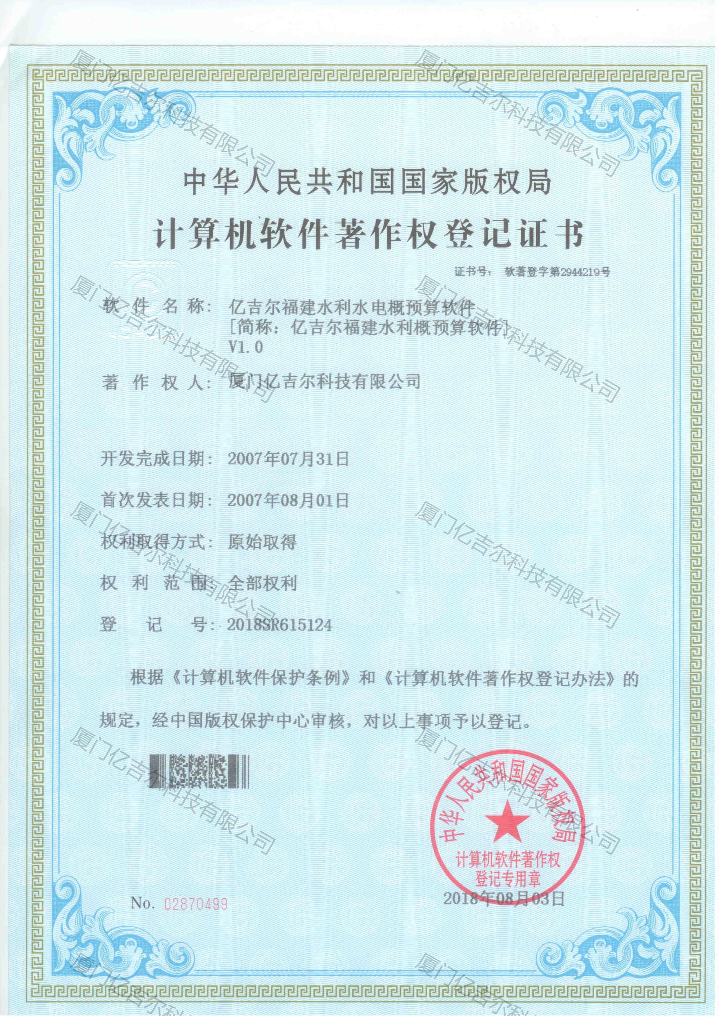 億吉爾福建水利水電概預算軟件著作權(quán)登記證書