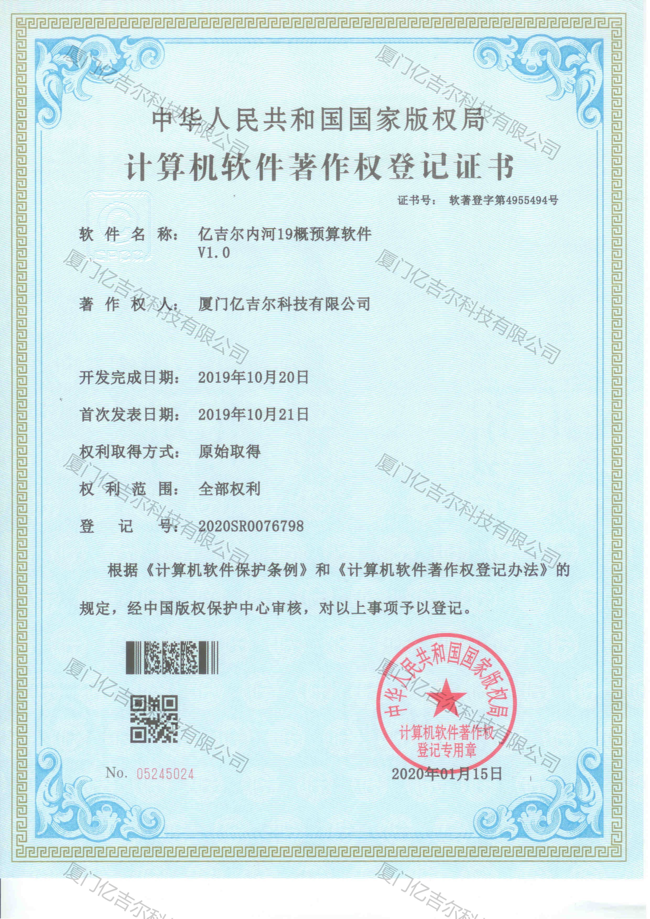 億吉爾內(nèi)河19概預(yù)算軟件著作權(quán)登記證書 發(fā)布日期:2020年01月15日 瀏覽次數(shù):4223 關(guān)鍵字: 公司 1/1億吉爾內(nèi)河19概預(yù)算軟件著作權(quán)登記證書