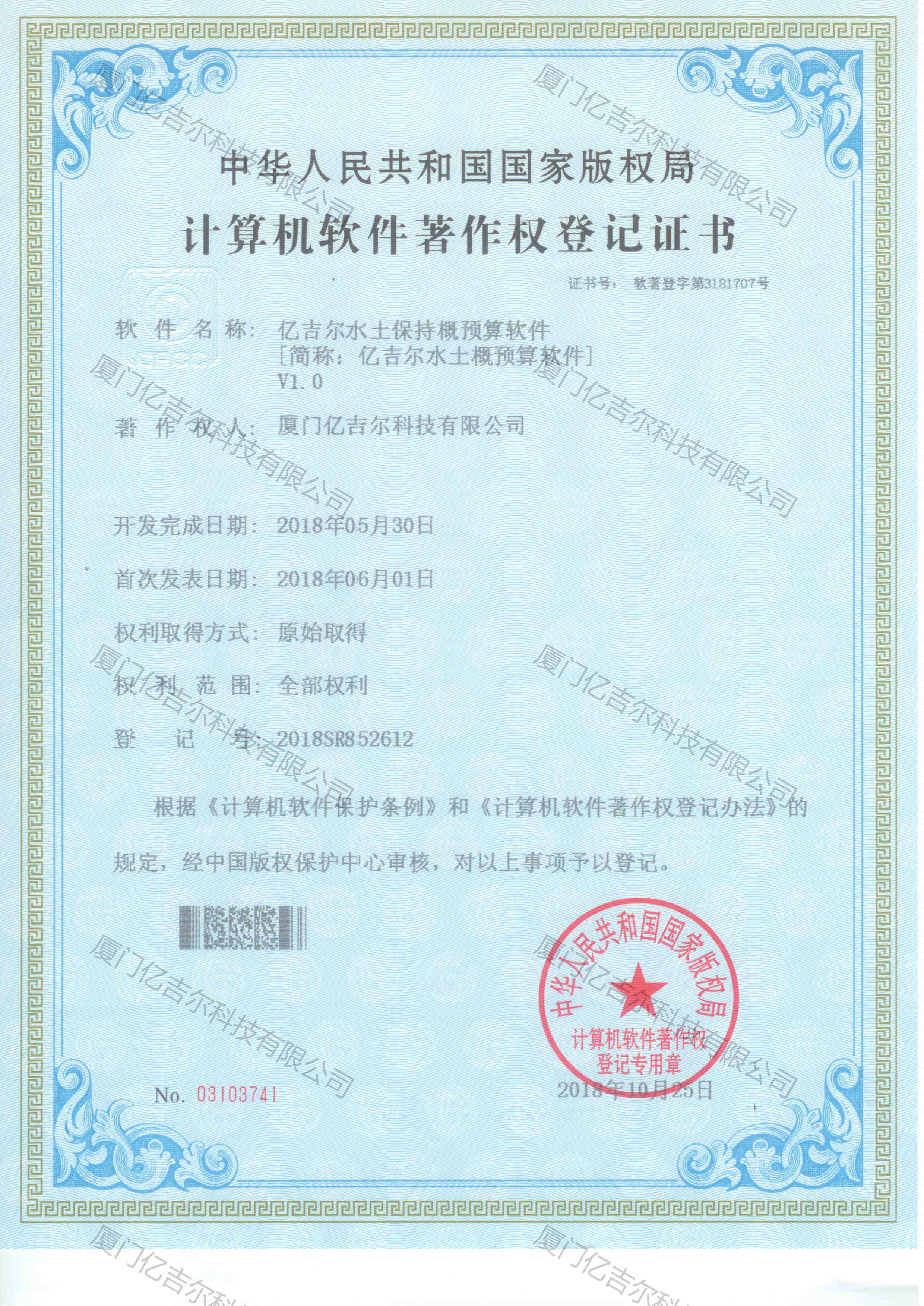 億吉爾水土保持概預(yù)算軟件著作權(quán)登記證書 發(fā)布日期:2018年10月25日 瀏覽次數(shù):3901 關(guān)鍵字: 公司 1/1億吉爾水土保持概預(yù)算軟件著作權(quán)登記證書