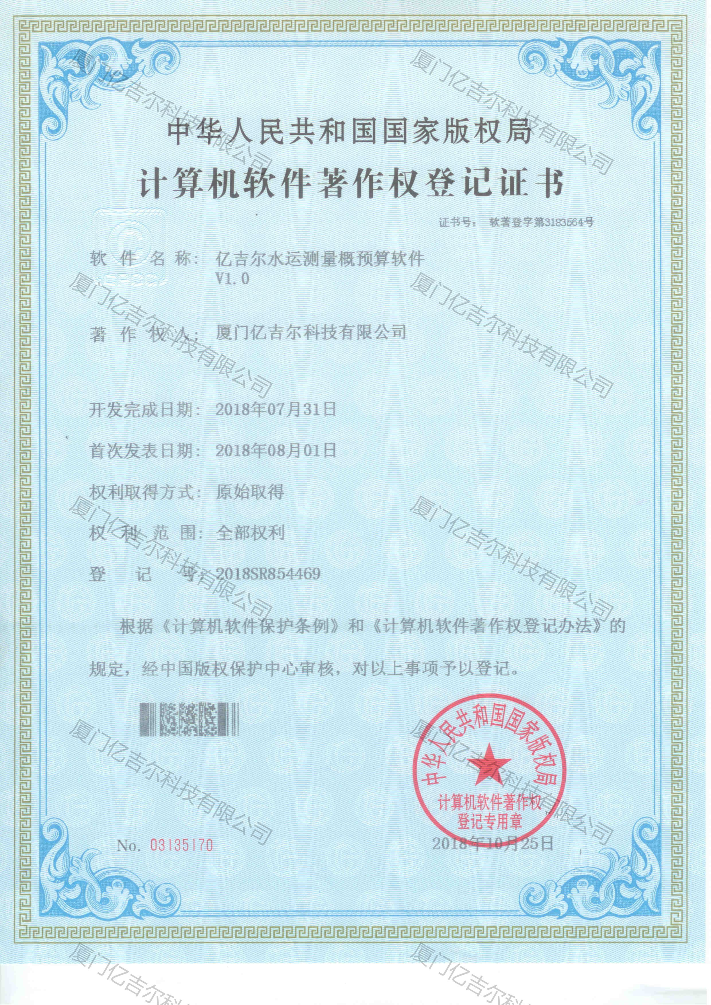 億吉爾水運(yùn)測(cè)量概預(yù)算軟件著作權(quán)登記證書(shū)