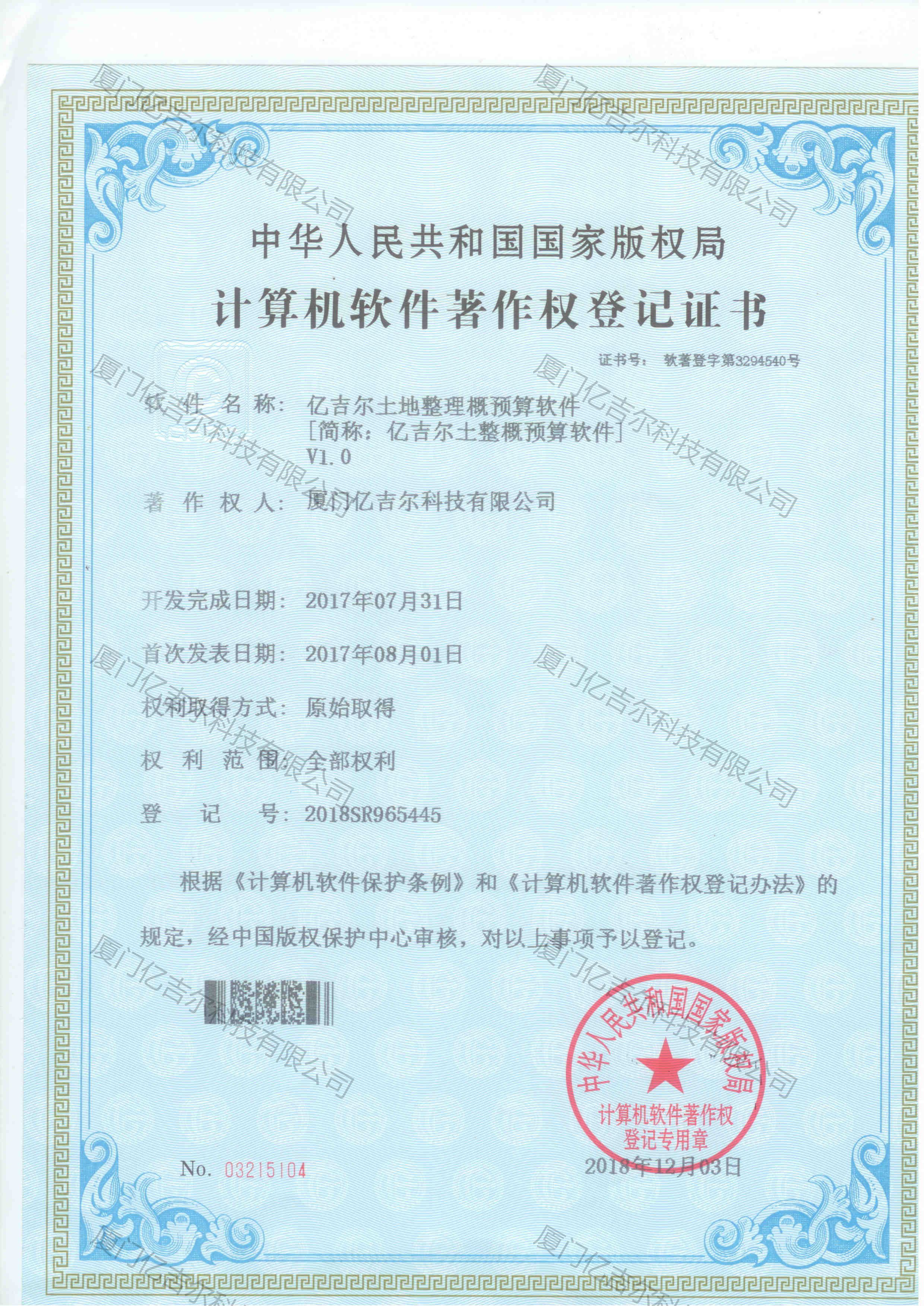 億吉爾土地整理概預(yù)算軟件著作權(quán)登記證書