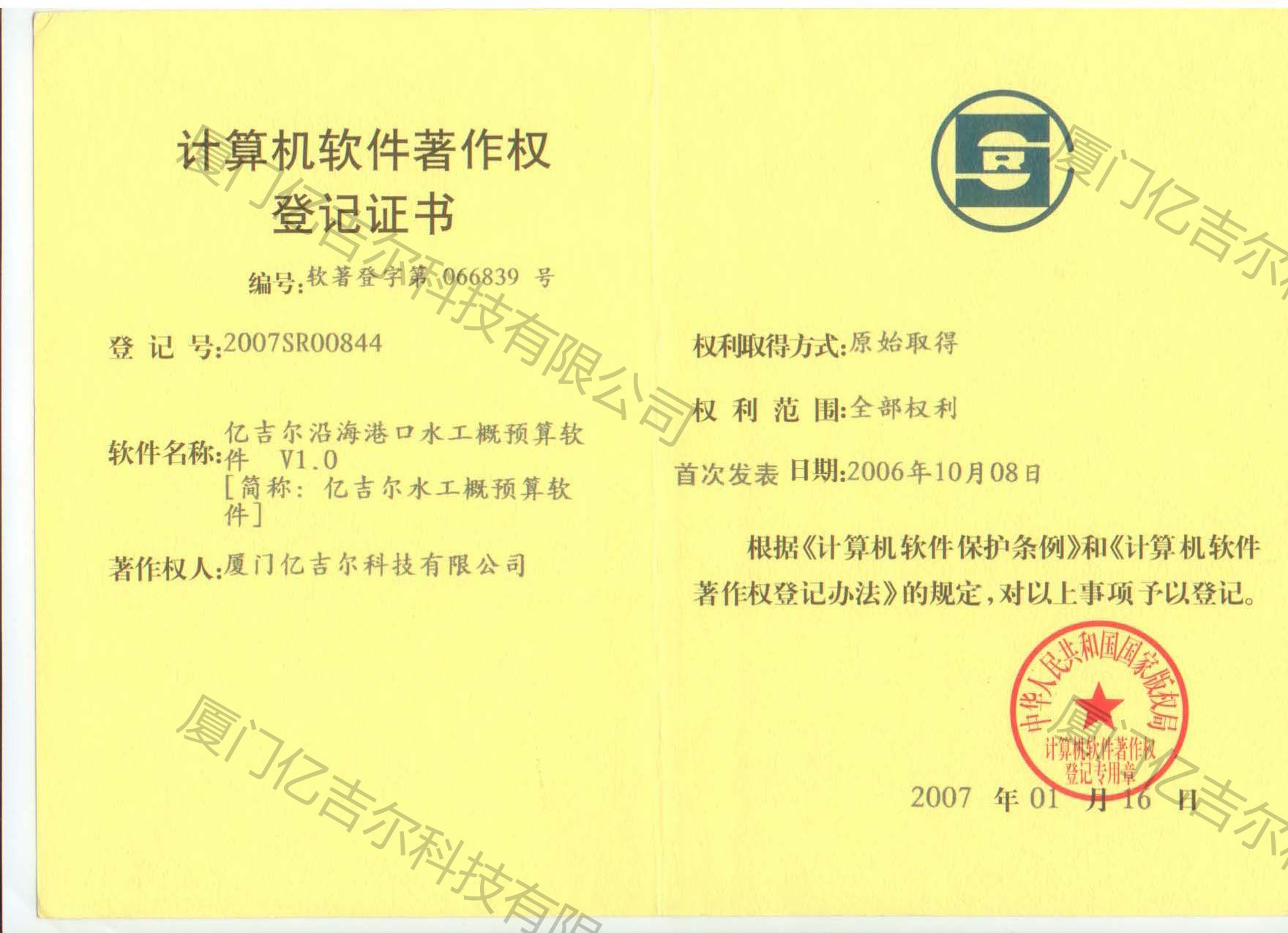 億吉爾沿海港口水工軟件著作權(quán)登記證書 發(fā)布日期:2007年01月16日 瀏覽次數(shù):3676 關(guān)鍵字: 公司 1/1億吉爾沿海港口水工軟件著作權(quán)登記證書