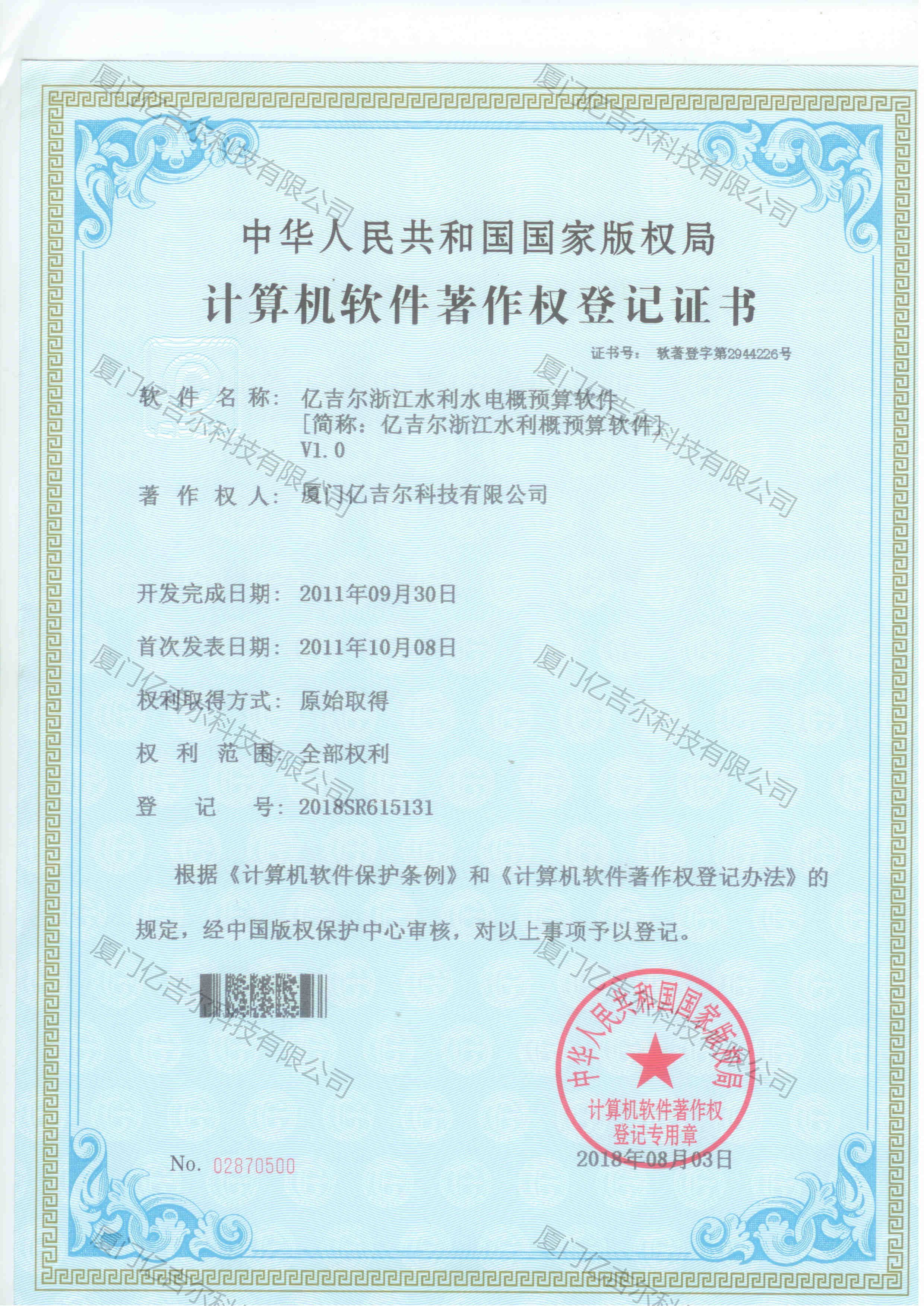 億吉爾浙江水利水電概預(yù)算軟件著作權(quán)登記證書(shū) 發(fā)布日期:2018年08月03日 瀏覽次數(shù):3577 關(guān)鍵字: 公司 1/1億吉爾浙江水利水電概預(yù)算軟件著作權(quán)登記證書(shū)